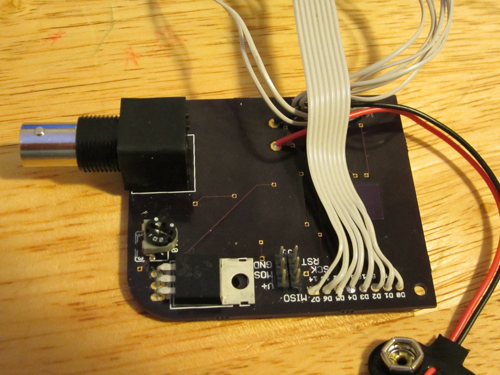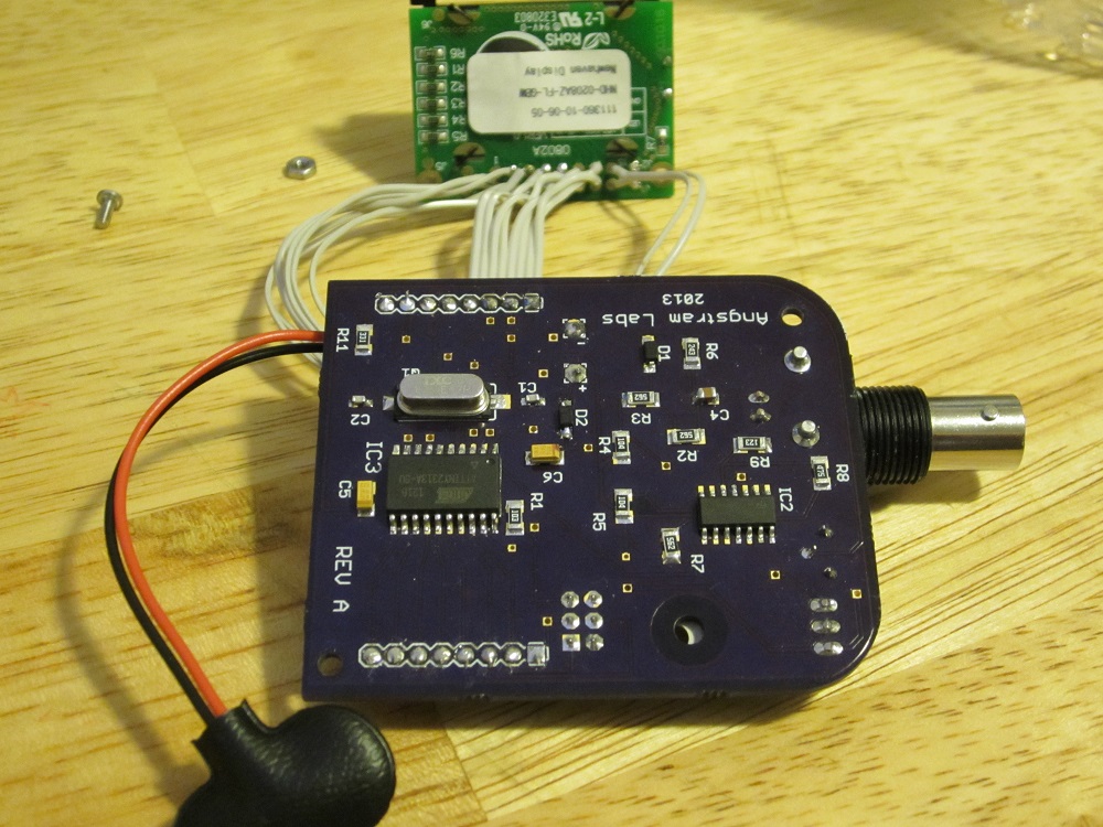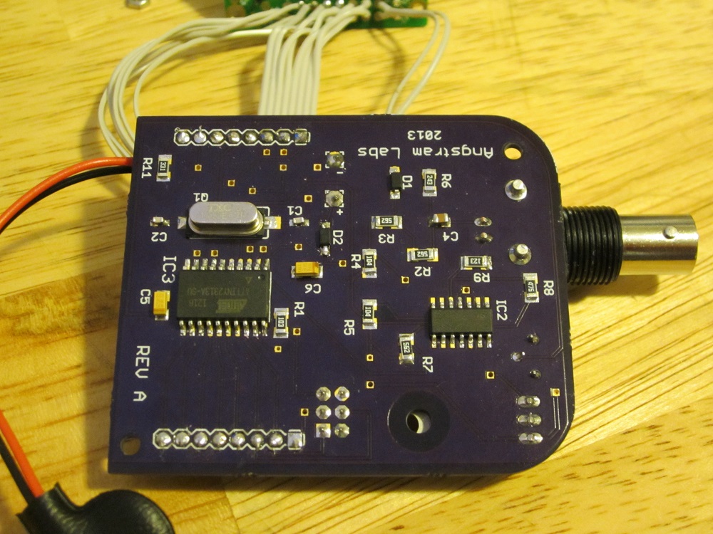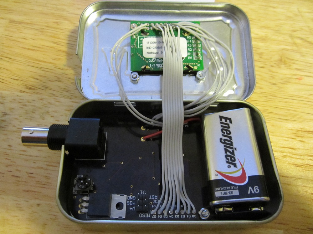 Frequency meter (final stage) Finally I finished my frequency meter project. What is inside? PCB, view from front side. PCB, view from back side. PCB in box, screws put on place and battery connected.